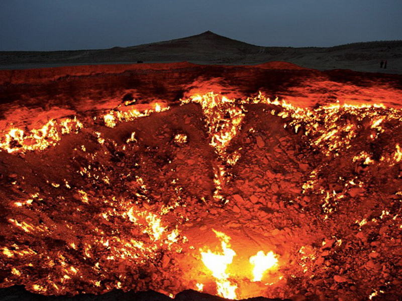 Чтобы вредные газы не выходили наружу, в 1971 году геологи подожгли наполненную газом пустоту, образовавшуюся в ходе разведки скопления подземного газа, полагая, что через пару дней огонь погаснет. Но пламя с тех пор так и не потухло, непрерывно горя днем и ночью. Местные жители и путешественники прозвали место "Дверью в преисподнюю".