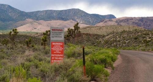 Легендарная база ВВС США, находящаяся в пустыне Невады. Официально основная специализация базы - разработка и испытания экспериментальных систем вооружения и самолетов. Однако вокруг нее ходит огромное количество легенд, согласно которым в этом месте хранятся обломки потерпевших крушение НЛО и даже представители внеземных цивилизаций. Часто упоминается в произведениях масскультуры: во многих играх, фильмах и книгах играет сюжетообразующую роль. Вывеска на плакате предупреждает, что у патруля есть право открывать огонь на поражение в случае нарушения границ.