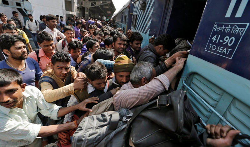 На фото: толпа пытается уместиться в поезд на вокзале Нью-Дели, 25 февраля 2016 года.
