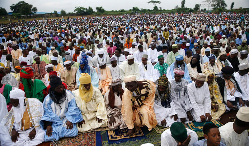 На фоне: молитва во время Ид-аль-Фитры, завершающая собой священный месяц Рамадан, 17 июля 20015 года.