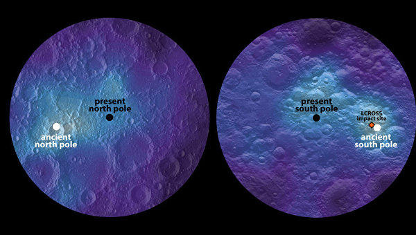 Залежи водяного льда на полюсах Луны, открытые зондом LRO, помогли ученым выяснить, что ось вращения спутницы нашей планеты сдвигалась в далеком прошлом в результате неравномерного охлаждения ее недр.