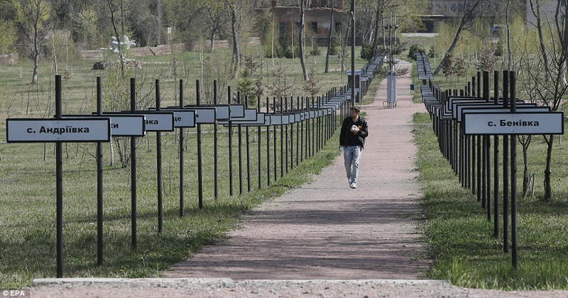 Мужчина прогуливается мимо дощечек с названиями заброшенных деревень.