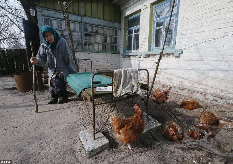Мария Семенюк, жительница Чернобыльской зоны, сидит возле своего дома с домашними курами.