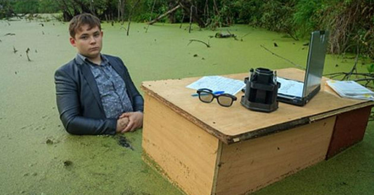 Снимки школьника за рабочим столом в болоте взорвали Интернет - ФОТО