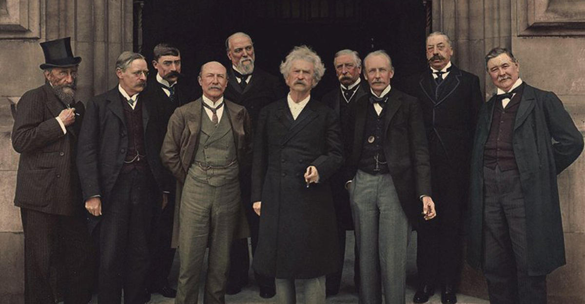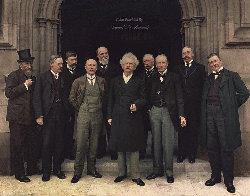 Марк Твен в Палате общин с сэром Джоном Бенджамином Стоуном, 1907 год.