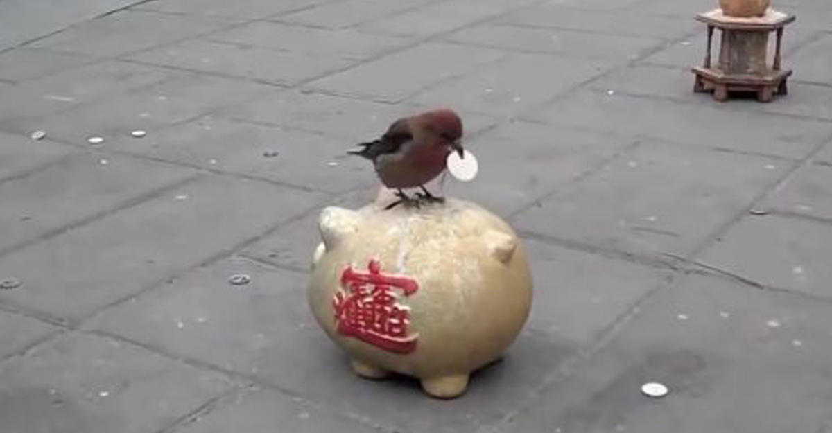 Крошечное пернатое берет у прохожих из рук протянутые ему монетки и аккуратно складывает их в копилку, после чего получает от хозяина зернышко в качестве поощрения. Неудивительно, что такой милый аттракцион пользуется у зевак большим успехом.