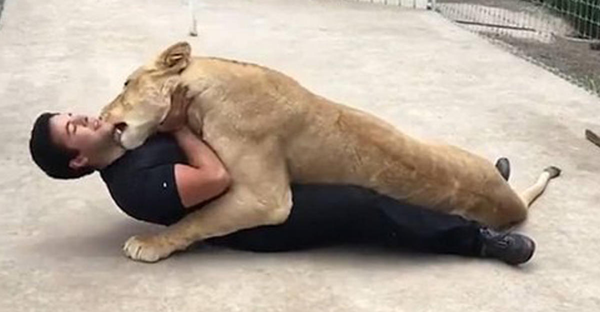 Видеоролик, снятый в приюте, показывает, как львица прыгнула на своего смотрителя, но лишь для того, чтобы заключить его в пылкие объятия.