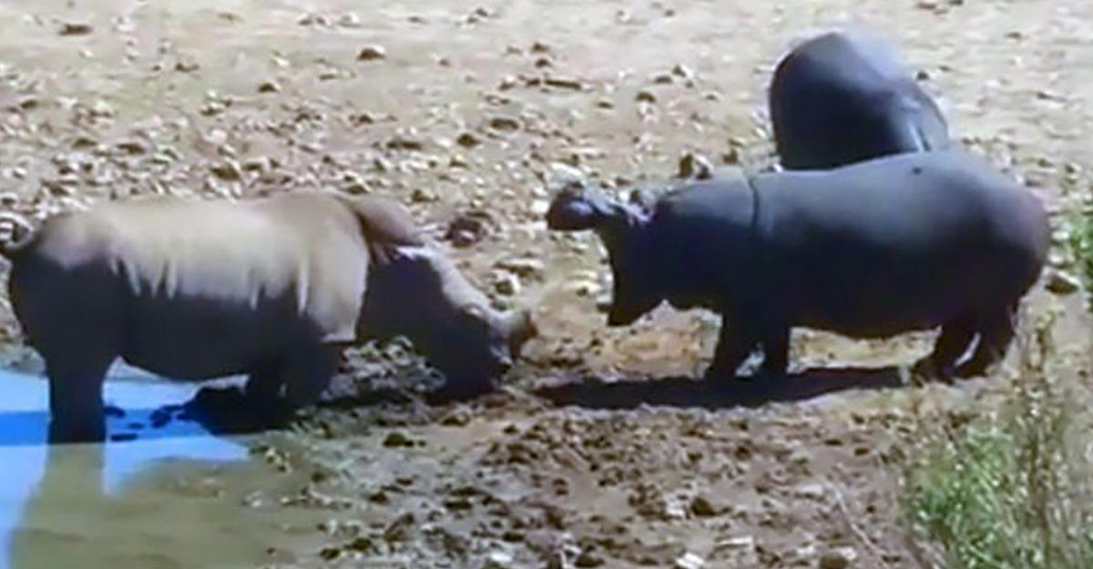 Разъяренный неуступчивостью носорога гиппопотам сначала принялся угрожающе рычать на занявшего место в воде носорога, затем предпринял попытку отогнать его от воды. После безуспешных попыток прогнать конкурента, бегемот ворвался в водоем, сбил носорога с ног, а затем убил его.