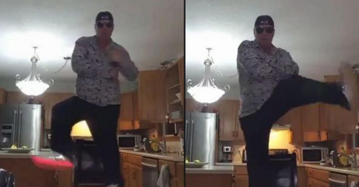 Мужчина оказался на полу после того, как выполнил танцевальные движения, стоя на стуле. Судя по тому, что он не сразу появился в кадре, можно сделать вывод о болезненности "приземления".