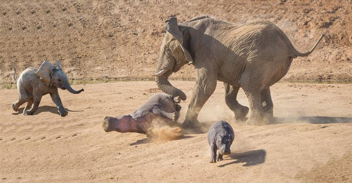 Разъяренная слониха избила хоботом бегемотов, защищая детеныша - ВИДЕО