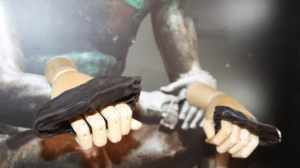Кожаные боксерские перчатки хорошо сохранились благодаря бескислородной среде под бетонным полом, которую римляне построили в конюшне для кавалерии.