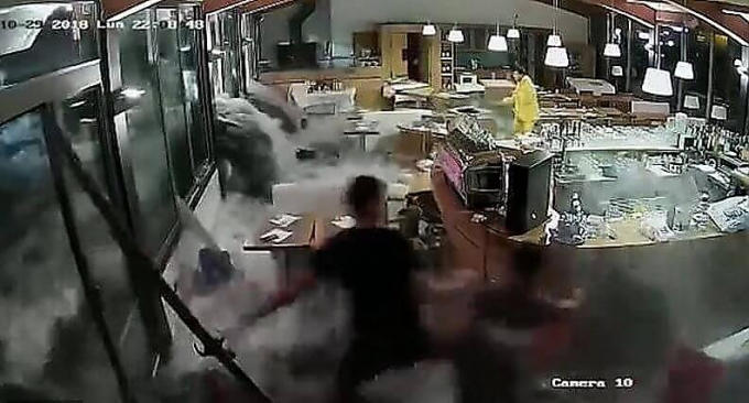 Видеокамера, установленная в ресторане Bagni Maddalena, расположенном в курортном городе Аренцано (регион Лигурия, провинция Генуя, Италия), зафиксировала момент настоящей катастрофы, когда волна, разбив окна, затопила первый этаж заведения, передает Day.Az со ссылкой на rai77.com.