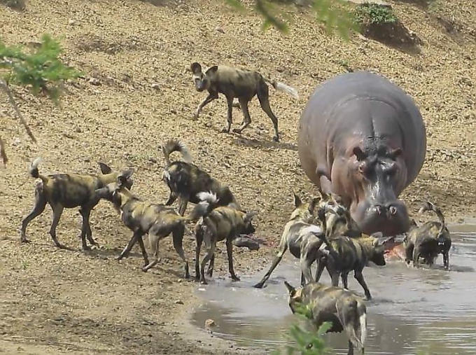 В итоге собаки утащили в кусты свою добычу, а бегемот не стал противостоять собачьей своре и скрылся из вида. Затем налетевшие стервятники поторопили хищников с приёмом пищи и вынудили их оставить тушу.