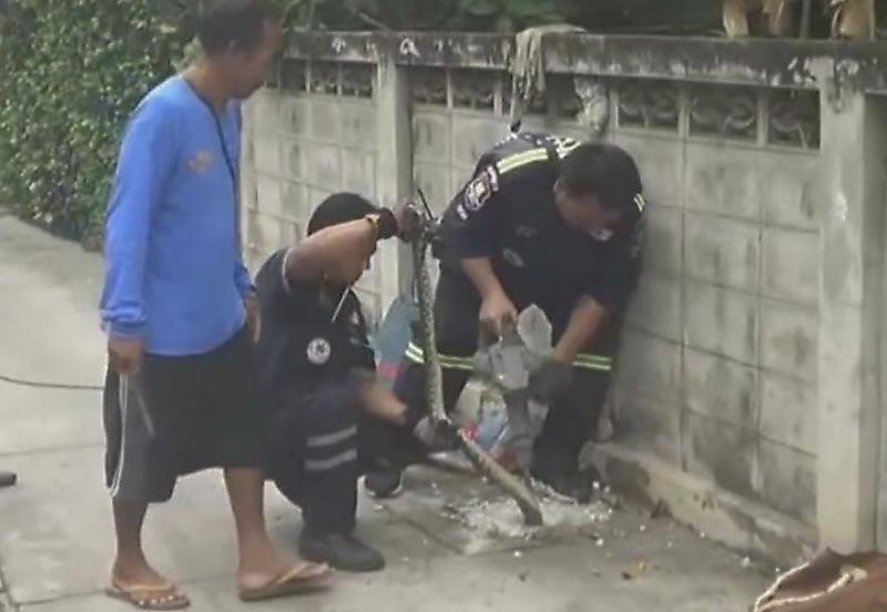 Питону, уползающему от дворовых псов и застрявшему в сливной скважине, в небольшом населённом пункте провинции Чонбури, потребовалась помощь спасателей.