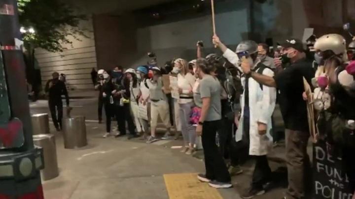 Сегодня чтобы оттеснить протестующих от здания суда, федеральные агенты вновь применили слезоточивый газ. Толпа отступила с площади перед зданием суда и перешла на соседние улицы. Многим пострадавшим от слезоточивого газа оказывали помощь медики-добровольцы, группы молодежи пытались защитить отступающих самодельными щитами, зонтиками и просто поднятыми руками.