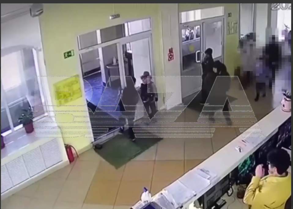 На кадрах видно, как одноклассница Тимофея преграждает ему выход из школы, после чего к парню подходит местный охранник. В этот момент школьник бьёт его ножом в шею.