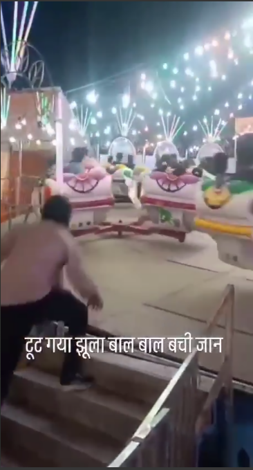 В одном из парков развлечений в Индии произошёл инцидент с участием посетителя. Мужчина выпал с аттракциона, напоминающего карусель в виде вращающейся машины, и на короткое время застрял между конструкциями.