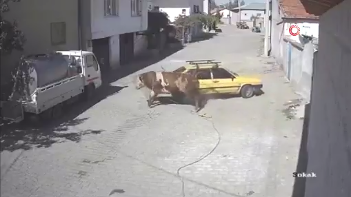 В Турции разбушевавшийся бык вступил в схватку с припаркованным автомобилем.