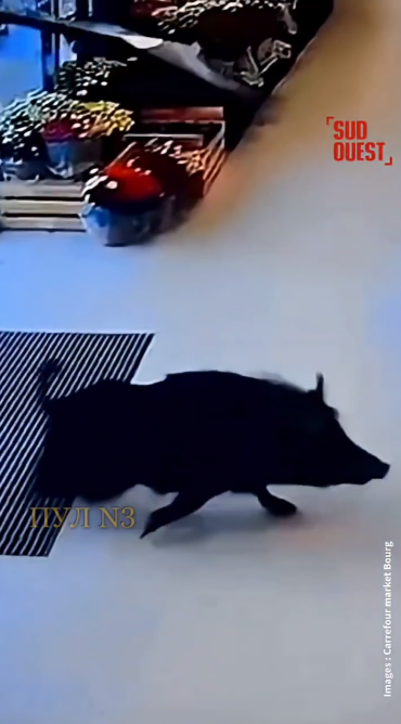 Во Франции кабан забежал в супермаркет, в буквальном смысле, выбив дверь.