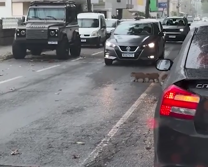 На видео можно заметить остановившиеся автомобили и животных, неторопливо переходящих улицу.