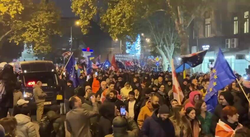 Как сообщает Day.Az, сторонники оппозиции устроили шествие в Тбилиси в годовщину протестов против решения властей приостановить переговоры о вступлении страны в ЕС до 2028 года.