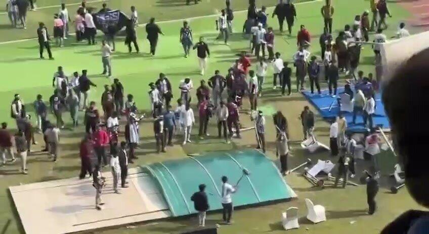 Фанаты были недовольны такой организацией и начали громить стадион, забрасывать поле бутылками.