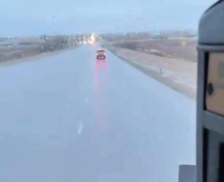 В Актау из-за гололеда автобус во время движения потерял управление, начал скользить и развернулся на проезжей части.