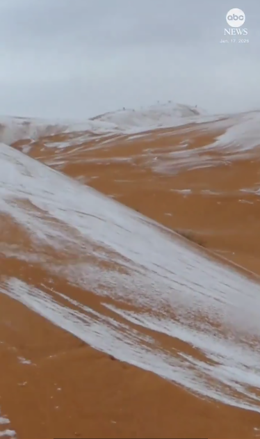 Как передает Day.Az, снежный покров начал образовываться примерно 17 января 2026 года, покрыв дюны пустыни белым слоем и создав необычайно живописный контраст с золотистым песком.