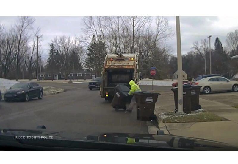 На записи видно, как сотрудник санитарной службы остановился на перекрестке, собираясь опорожнить мусорный бак, и уже катил его к мусоровозу, но, заметив внутри человека, начал махать руками, привлекая внимание стражей порядка.