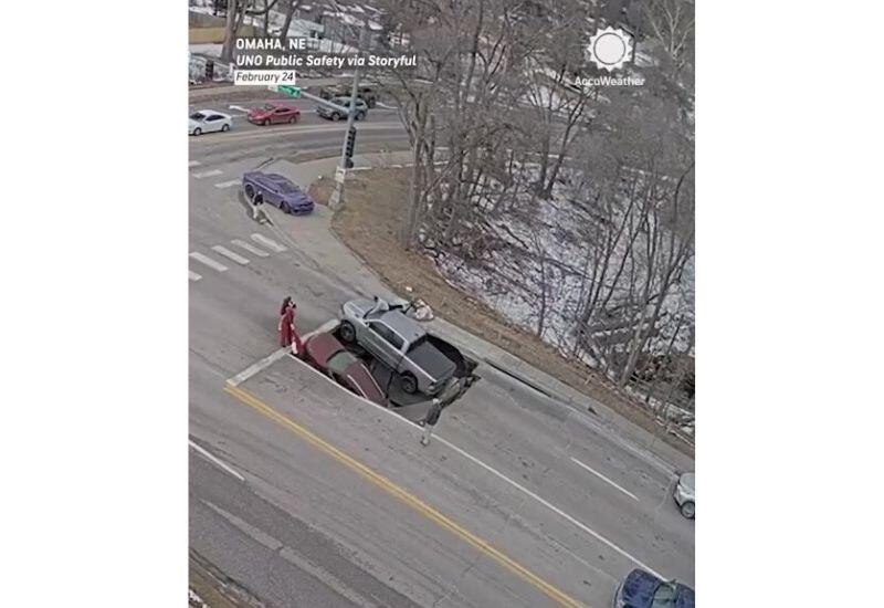 Видео необычного провала дорожного покрытия с двумя автомобилями, остановившимися на красный свет светофора в Омахе, штат Небраска, США, широко расходится по соцсетям мира.