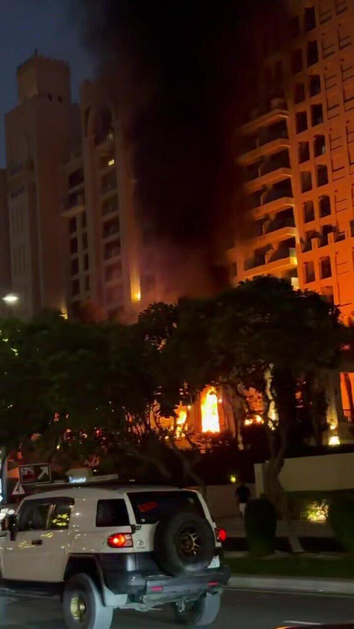 По предварительным данным, у входа в пятизвездочный отель Fairmont The Palm рухнули обломки иранской ракеты. Сейчас на месте происшествия сильный пожар.