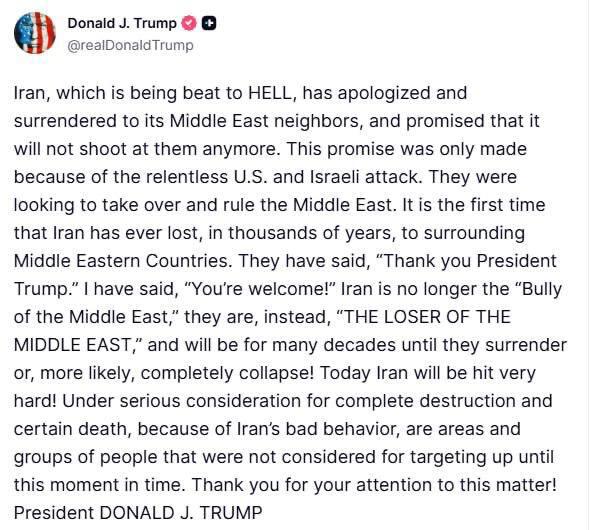 "Это обещание было дано только из-за непрекращающихся ударов США и Израиля. Они стремились установить контроль и править Ближним Востоком. Впервые за тысячи лет Иран потерпел поражение от окружающих его стран региона.