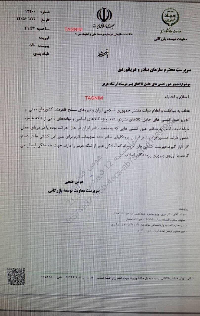 "Разрешен проход судов, перевозящих товары первой необходимости и гуманитарную помощь, следующих в иранские порты или порты, расположенные в Оманском заливе", - говорится в сообщении.