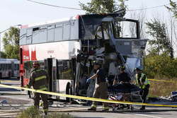 По предварительным данным, погибли шесть пассажиров автобуса, еще 30 пострадали, десять находятся в тяжелом состоянии.