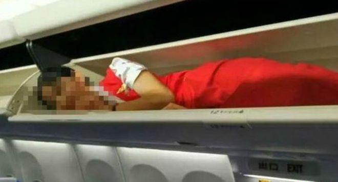 Китайская авиакомпания Kunming Airlines оказалась в центре скандала после того, как в Сети появились фотографии ее бортпроводниц, лежащих в самолете на верхних полках для ручной клади.
