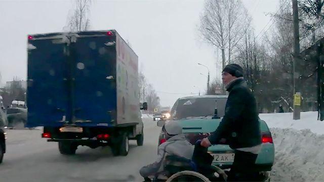 Однако также на регистратор попал и занимательный момент, когда мужчина, который приехал к попрошайкам на такси, заставил ребенка сесть в инвалидную коляску. Мальчик с легкостью запрыгнул в коляску сам.
