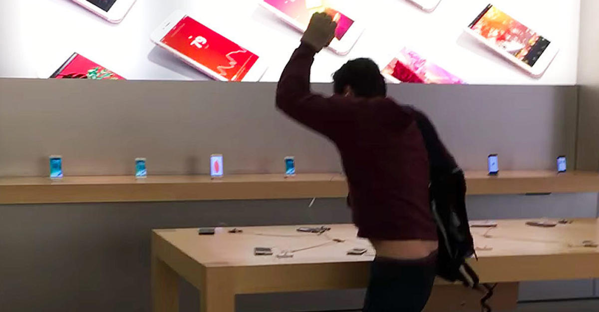 Неизвестный мужчина в темных очках, войдя в магазин, принялся уничтожать смартфоны, вооружившись стальным шаром, пишет The Verge.