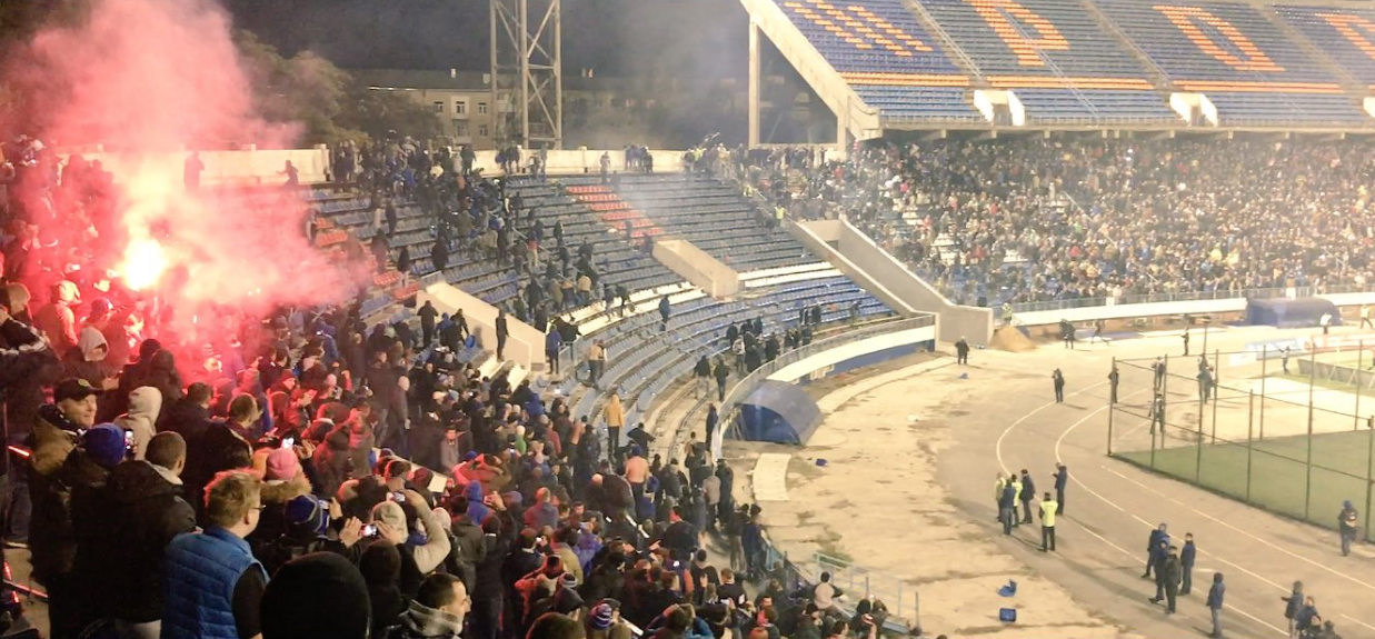 Фанаты спустились с трибун прямо за ворота и зажгли файеры, в результате чего половину поля заволокло дымом и продолжать матч было невозможно.