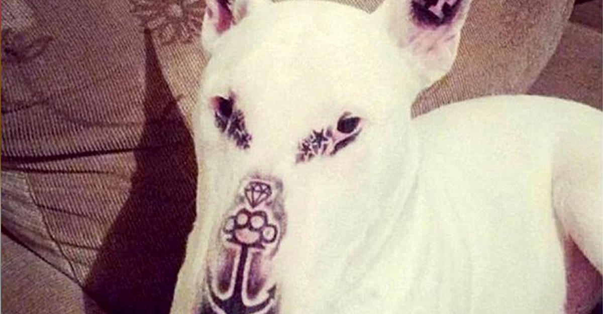 На морде белого бультерьера хозяин набил татуировку, сообщает Daily Mail.