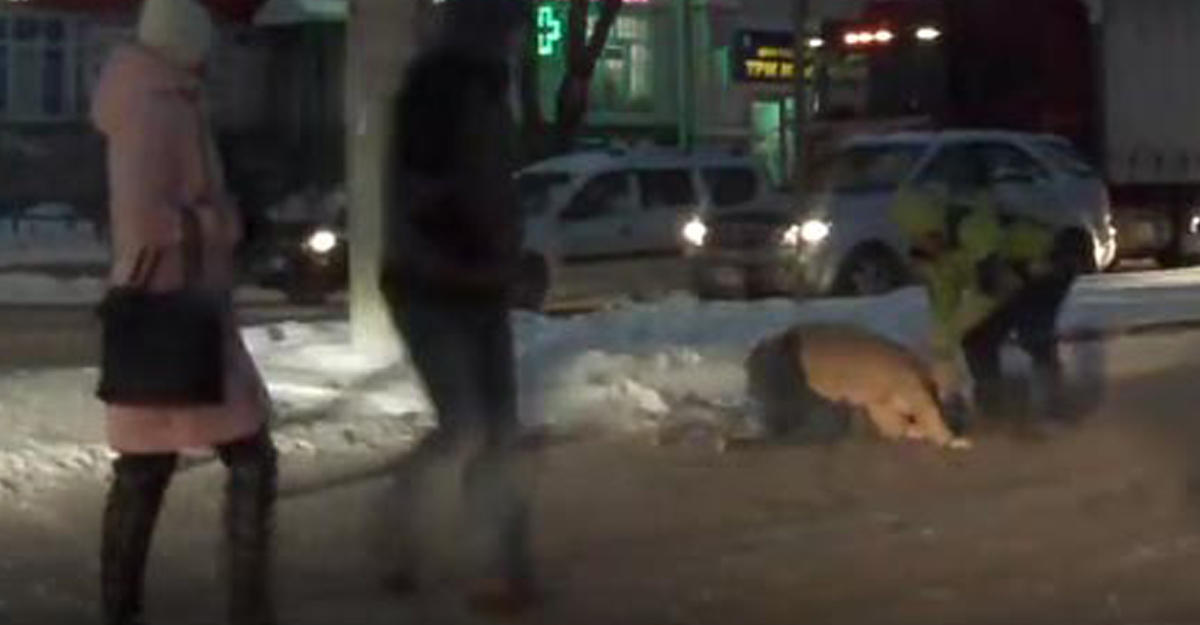 На съемке видно, как водитель Мazda оставляет свою машину на дороге и бросается с кулаками на прохожего, который в тот момент пересекал проезжую часть. На ней же и развернулось противостояние. Конфликтующие били и бросали друг друга на покрытый снегом асфальт, не замечая проезжающих мимо автомобилей.