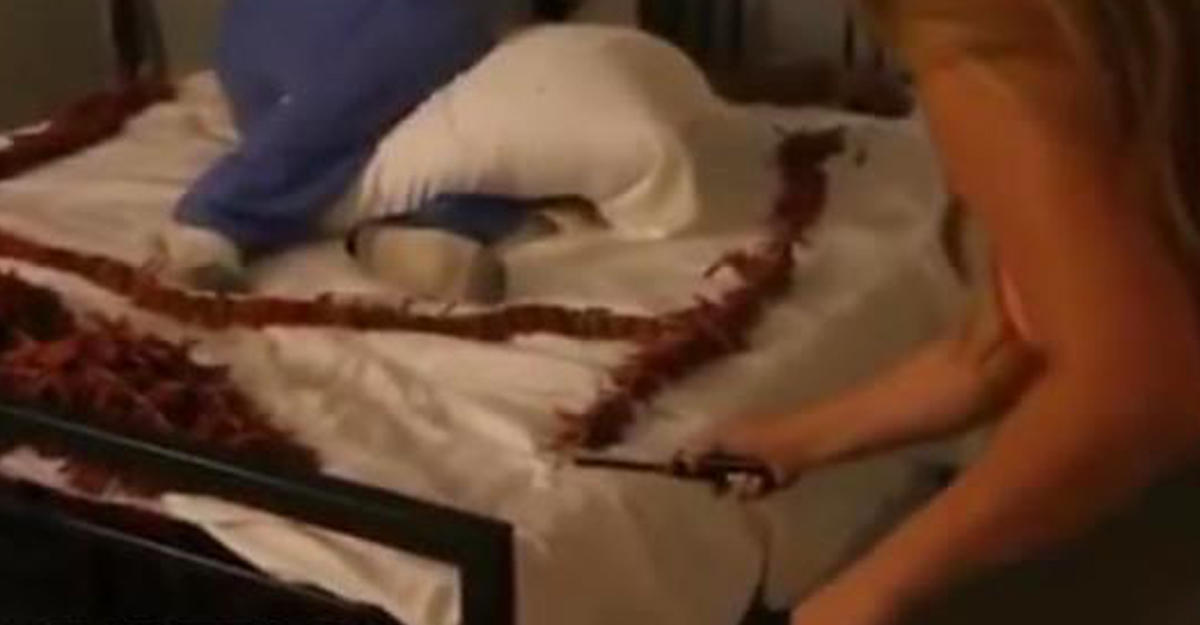 На шокирующем видео девушка разложила десятки фейерверков вокруг своего спящего парня. Таким образом она решила разбудить его.