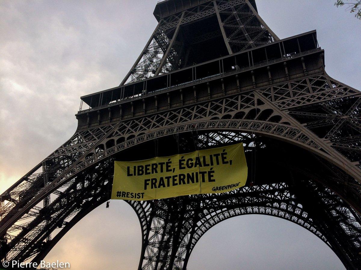 Активисты Greenpeace утром в пятницу развернули на Эйфелевой башне в Париже большую растяжку с национальным девизом Франции - надписью "Свобода. Равенство. Братство", протестуя против партии "Национальный фронт" накануне второго тура президентских выборов, передает Day.Az со ссылкой на РИА Новости.