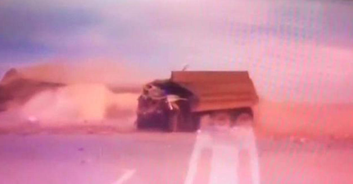 На нем видно, как машина пытается повернуть налево и в этот момент в нее на полной скорости летит грузовик "КамАЗ" с полным кузовом картошки. Протащив легковушку несколько метров, он врезается в другой большегруз.