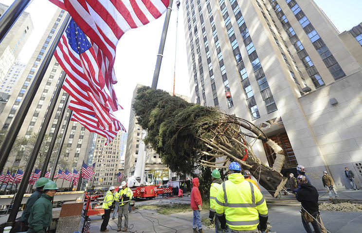 Главный символ Рождества по традиции был установлен на площади Рокфеллер-плаза в центре Манхэттена. На специальный постамент дерево водрузили с помощью строительного крана.