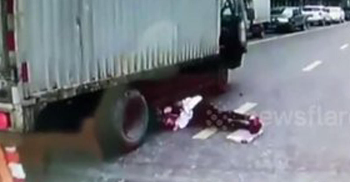 Девушка чудом выжила под колёсами грузовика - ВИДЕО