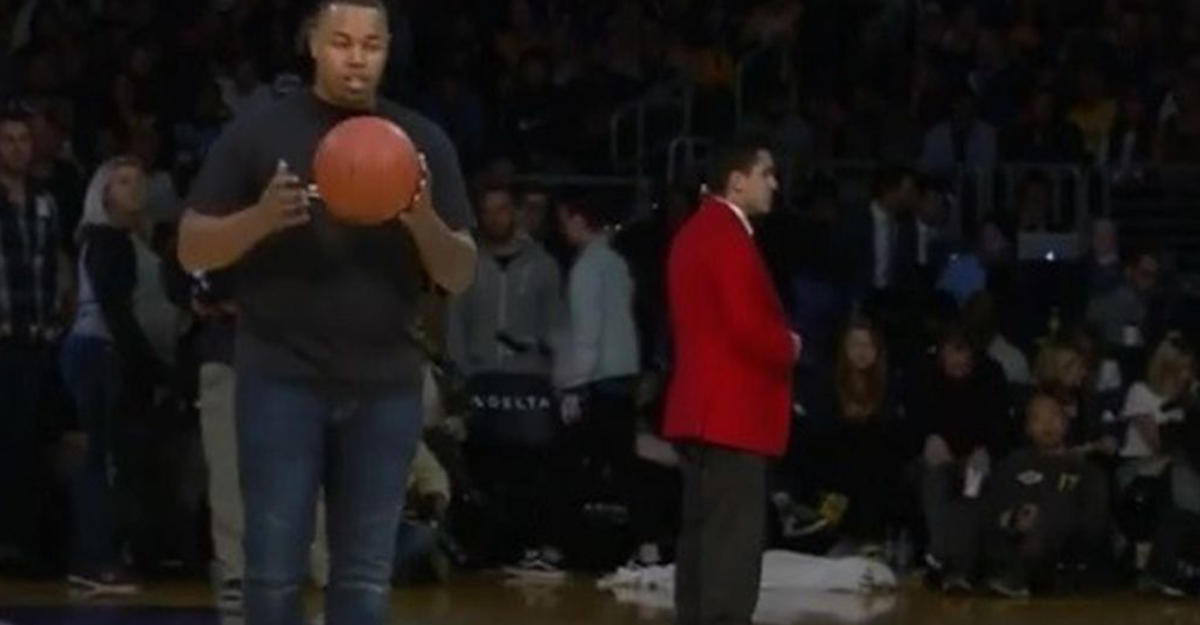 Попытать судьбу решил один из болельщиков "Лейкерс" Сани Стронг. Парню с центра площадки нужно было забросить мяч в кольцо. И ему это удалось. В качестве приза Стронг выиграл чек в лотерею на сумму $100 тыс.