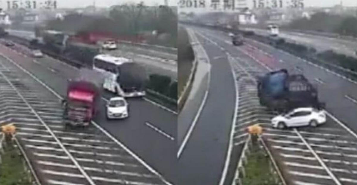 Затем автомобилист, увидев масштабы "бедствия", начал перестроение, но во второй раз оказался на пути другого грузовика, водитель которого успел остановиться, после чего его транспортное средство сложилось.