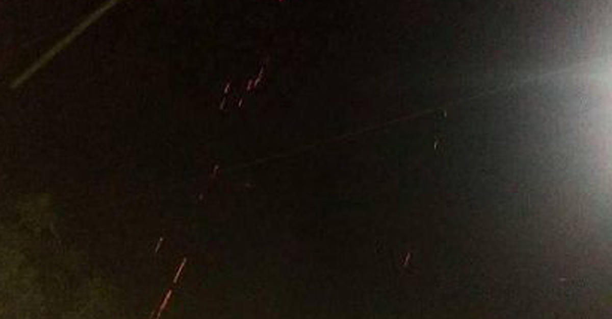 На кадрах видно, как в ночном небе показывается светящаяся красная точка, затем она затухает, а через несколько секунд появляется вспышка.