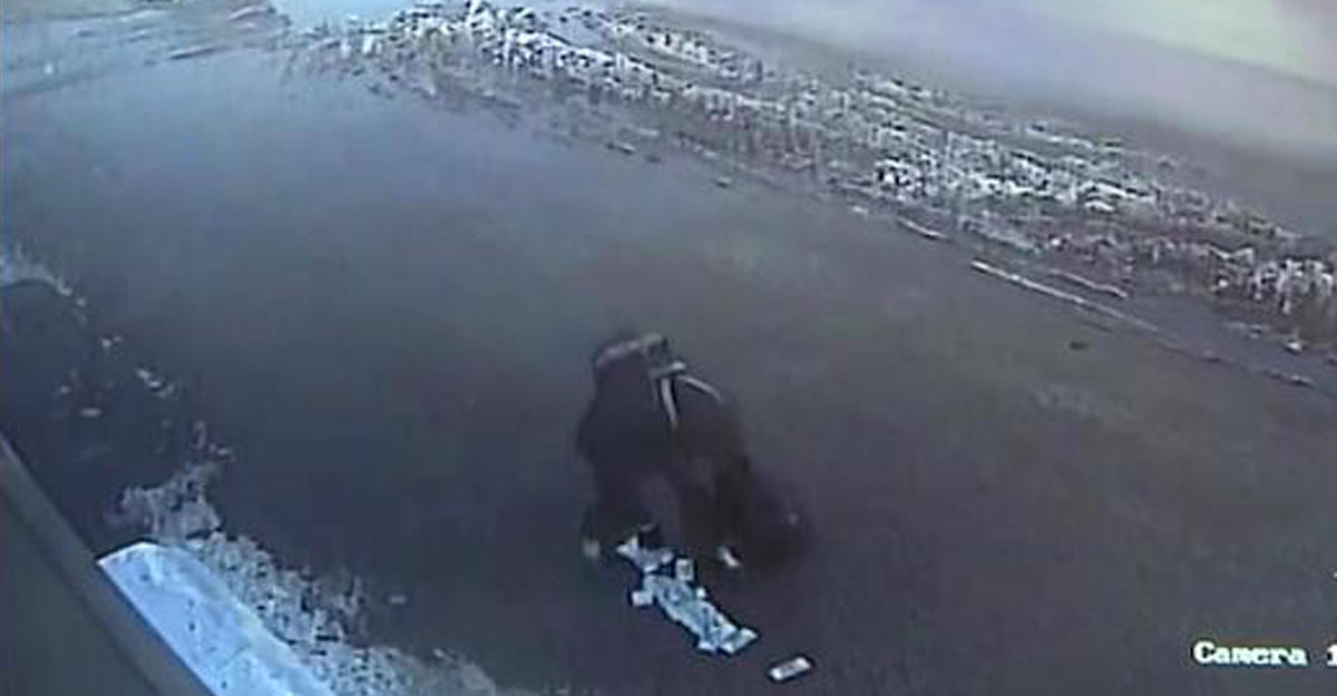На ролике видно, что мужчина несет по улице черную спортивную сумку с добычей. В какой-то момент он роняет часть денег на землю, но даже не пытается поднять их все.